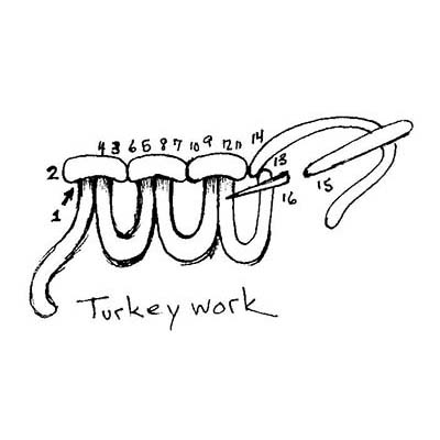 Follow the diagram for needle and stitch placement. You may need to use both hands to help create the loops of this stitch. The length of the loop determines the depth of the stitch. As you work this stitch in a group, try to stay consistent with the length of the loop. You can cut the loops when you are finished stitching, or leave them for a curly look. When working this stitch in rows, work from the bottom.