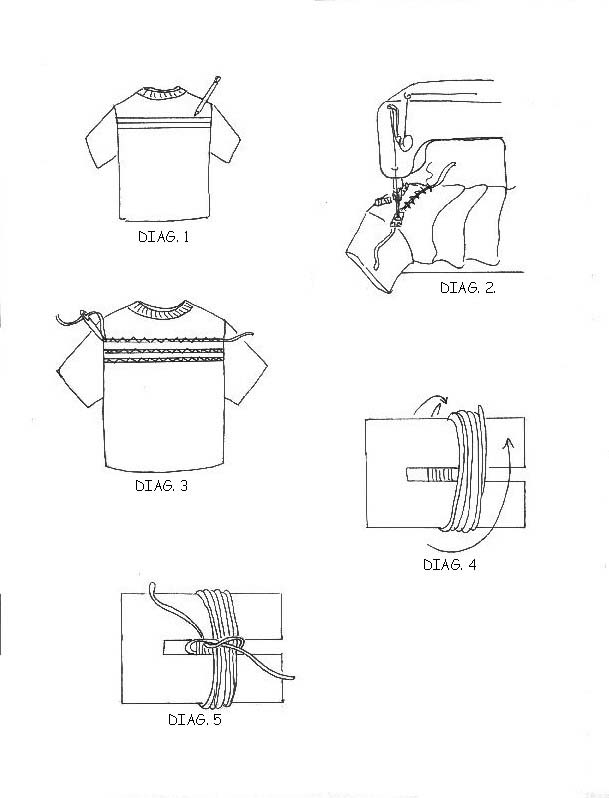 Set up your sewing machine with the matching thread. Starting at one sleeve seam, lay one color thread over the top line and zigzag it to the shirt. (Diag. 2). Try NOT to stretch the shirt as you sew.Leave a thread tail at both ends of the line about 3” long.(By the way, zigzagging over a thick thread is called “couching”.) Zigzag or couch over the middle line with the second color thread. Couch the last line with the first color thread.