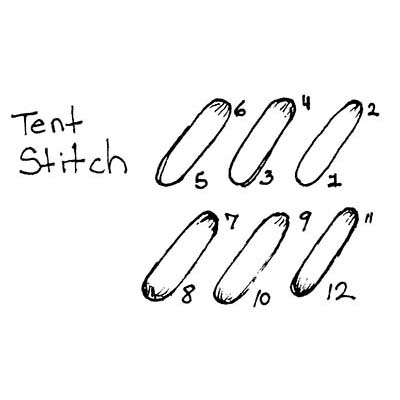 One of the most basic needlepoint stitches, tent stitch is used on canvas to construct the "fabric" or design. This stitch provides strong coverage on the front and back of your work to make a more durable piece of embroidery. On the front of your work, this stitch is similar to a half-cross stitch used on fabric in cross stitch and counted thread techniques.